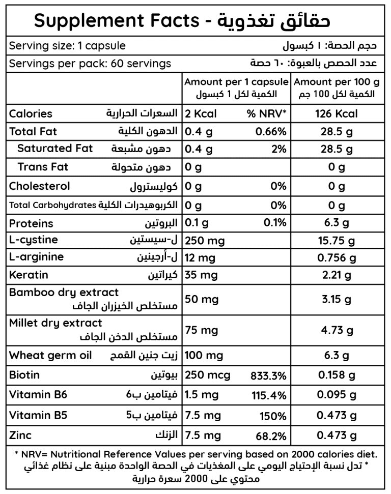Multivitamins Food Supplement Capsules with Zinc, Keratin Amino acids (L-cystine and L-arginine) Herbal Extracts (Bamboo dry extract) Millet dry extract and Wheat germ oil)