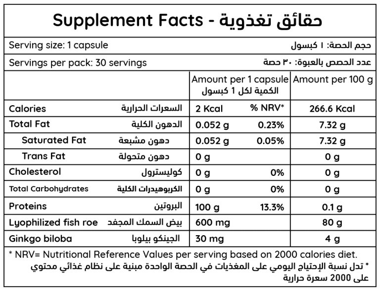 Food Supplement Capsules containing Lyophilized Fish Roe and Ginkgo biloba.