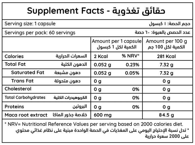 FOOD SUPPLEMENT CAPSULES CONTAINING MACA EXTRACT 600 mg.