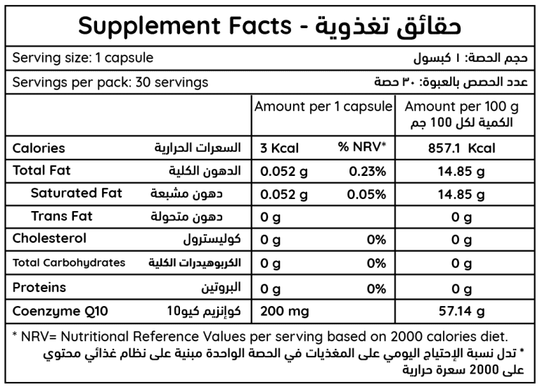 Food Supplement Capsules containing Co-Enzyme Q10 200mg.