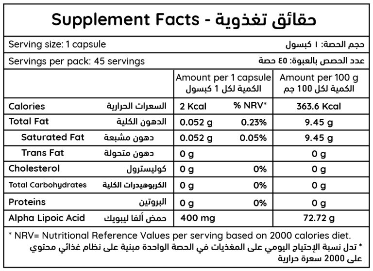 FOOD SUPPLEMENT CAPSULES CONTAINING Alpha Lipoic Acid: 400 mg